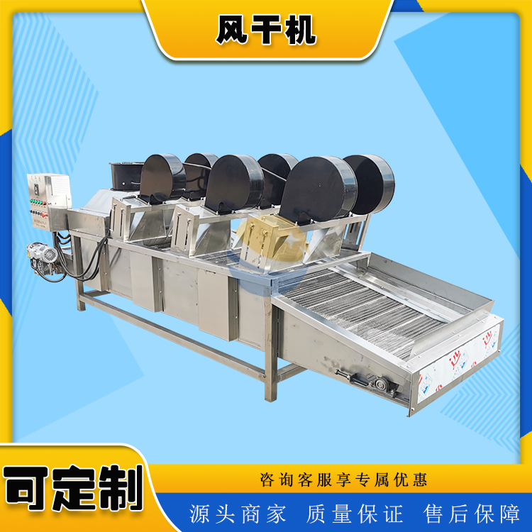 采用常温强流风的作用,去除产品表面的水分,以达到产品的要求。该机采用连续间断式物料输送系统,使物料进行平稳运行,在物料送过程中,通过间断的网带输送速度差别及高度差别,实现物料的均摊,达到各个表面的受风均匀性。由于产品采用常温强风吹干水分,即避免了人工除水的不彻底性和二次污染,产品的自动吹干功能,减少了加工厂的人员安排,节省了劳动力,并且与其它设备可随意连接形成流水化作业。